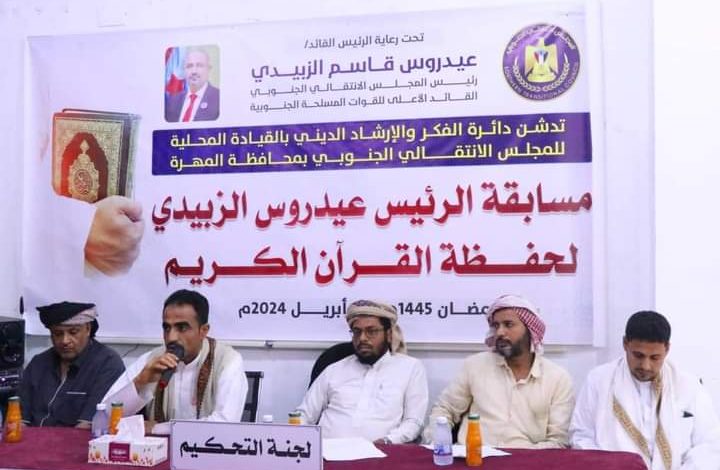 دشنت إداره الفكر والإرشاد الديني بالهيئة التنفيذية للقيادة المحلية للمجلس الانتقالي بمحافظة المهرة مساء أمس الثلاثاء مسابقة الرئيس الزُبيدي للقرآن الكريم .