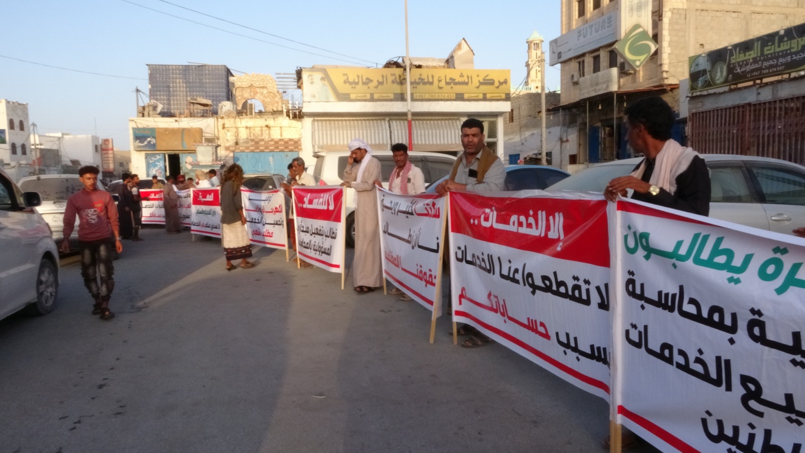 ورفع المحتجون لافتات تندد بانقطاعات الكهرباء وخدمة المياة وتطالب السلطة المحلية بالمحافظة بوضع حلول جذرية لمشكلة انقطاع التيار الكهربائي وتفعيل دور الرقابة والمحاسبة ونيابة الأموال العامة وإيقاف إيرادات المحافظة وتسخيرها في توفير الخدمات الأساسية للمواطنين.