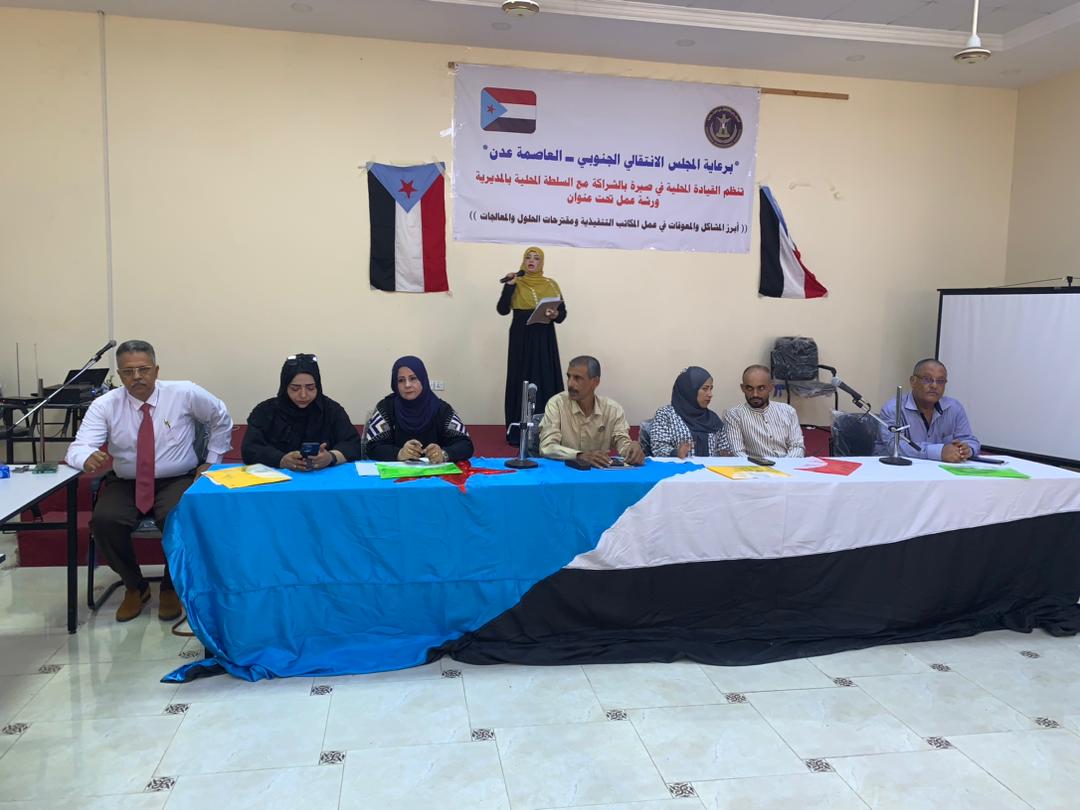 نظمت القيادة المحلية بالمجلس الانتقالي الجنوبي في العاصمة عدن، صباح اليوم، ورشة عمل تحت عنوان( ابرز المشاكل والمعوقات في عمل المكاتب التنفيذية ومقترحات الحلول والمعالجات) بالمديرية .