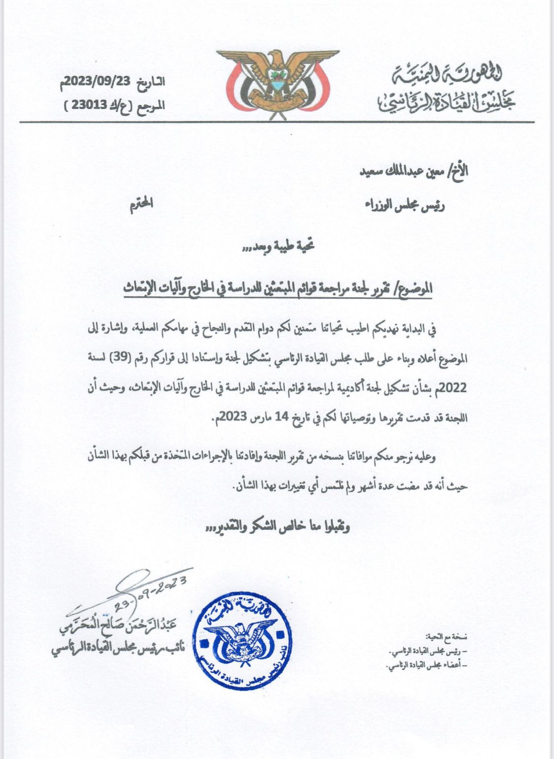 طالب النائب ابو زرعة المحرمي عبر مذكرة موجهة لرئيس الحكومة معين عبدالملك بتقرير لجنة مراجعة قوائم المبتعثين للدراسة في الخارج وآليات الابتعاث، مطالبا معين عبدالملك بالإجراءات التي اتخذها بهذا الشأن.
