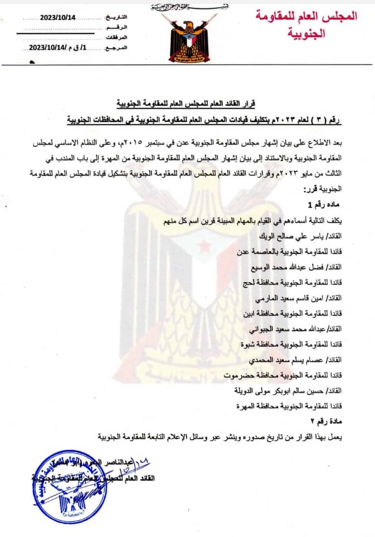 بعد الاطلاع على بيان إشهار مجلس المقاومة الجنوبية عدن في سبتمبر ٢٠١٥م، وعلى النظام الأساسي لمجلس المقاومة الجنوبية وبالاستناد إلى بيان إشهار المجلس العام للمقاومة الجنوبية من المهرة إلى باب المندب في الثالث من مايو ٢٠٢٣م وقرارات القائد العام لمجلس العام للمقاومة الجنوبية بتشكيل قيادة المجلس العام للمقاومة الجنوبية قرر :