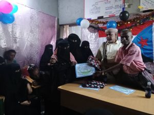 وفي الختام قامت دينا مانع ، ومحفوظ فرج ، ومحمد المسحري، وعيشة حسن صغير ، بتكريم 35 دارسة في مجال محو الأمية بهدف تشجيعهن لاستكمال المرحلة الثانية.