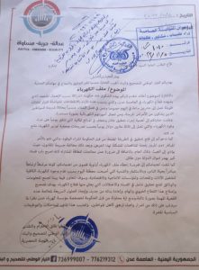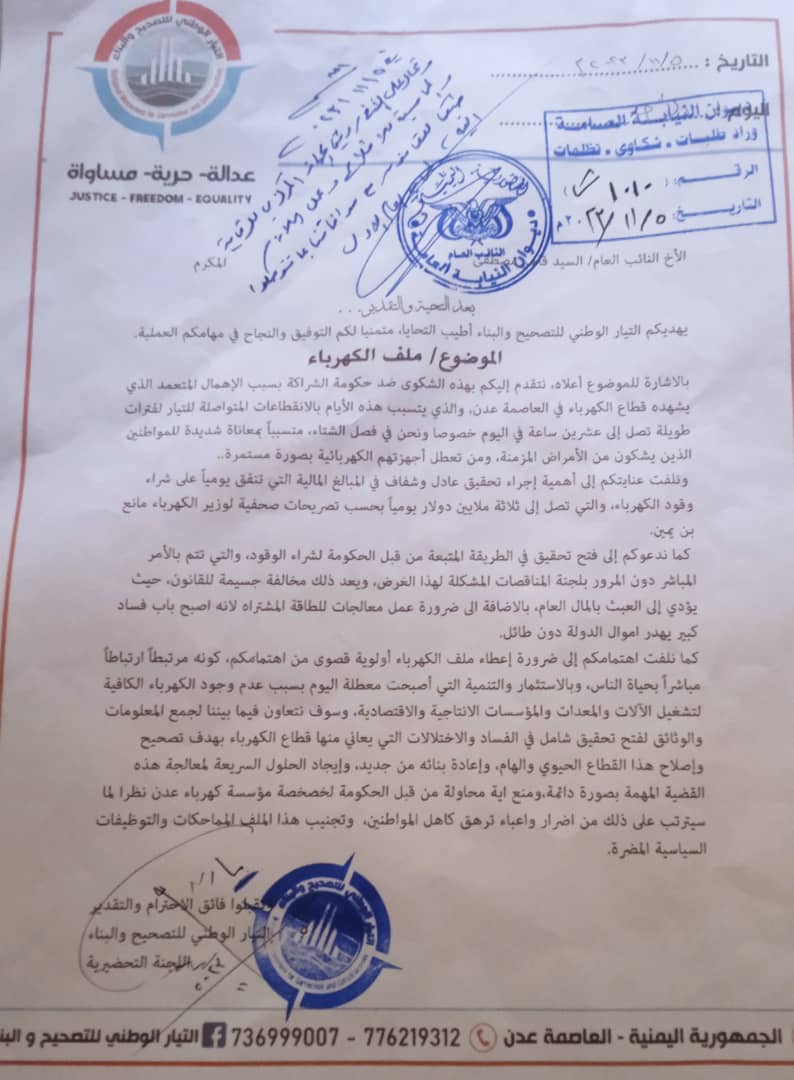 وطالبت اللجنة التحضيرية للتيار الوطني للتصحيح والبناء، الجهاز المركزي للرقابة والمحاسبة، التعامل بجدية مع توجيهات المحامي العام الاول التي طالبت رئيس الجهاز بالتحقيق في الشكوى المقدمة ضد حكومة الشراكة، بخصوص الفساد والعبث الذي طال ويطال ملف الكهرباء في عدن، والحرص على ان لا تذهب هذه التوجيهات في الدهاليز المغلقة كون ملف الكهرباء من اهم القضايا التي تمس وتهم حياة الناس بصورة مباشرة ويومية.