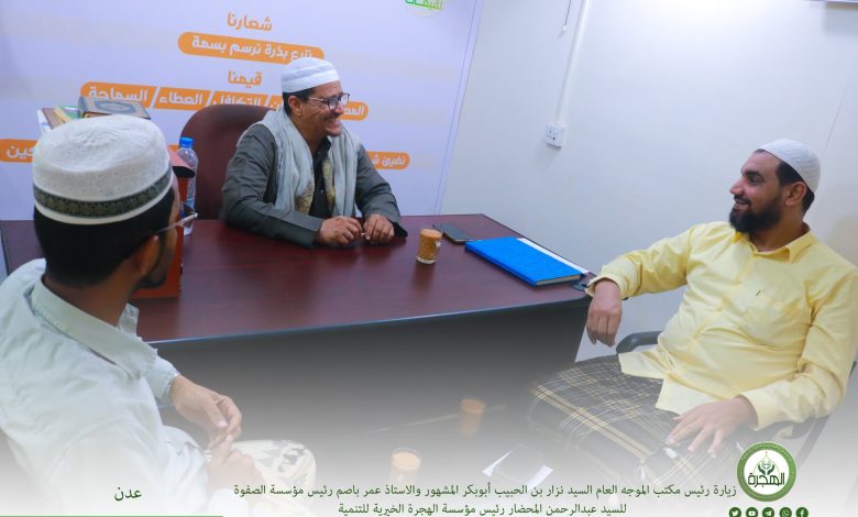 استقبل رئيس مؤسسة الهجرة الخيرية للتنمية السيد عبدالرحمن المحضار في مكتبه بالعاصمة عدن رئيس مجلس مكتب الموجه العام لأربطة التربية الإسلامية السيد نزار بن أبي بكر المشهور ورئيس مؤسسة الصفوة للتنمية الأستاذ عمر سالم باصم.