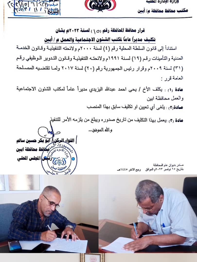 بناء على قرار محافظ محافظة أبين الأخ ابو بكر حسين سالم رقم 15 لعام 2023 ، والذي قضى بتكليف يحيى احمد اليزيدي مديرا عاما لمكتب الشؤون الاجتماعية والعمل ، تم اليوم صباح اليوم الأربعاء عملية تسليم واستلام لمكتب الشؤون الاجتماعية والعمل باشراف الأخ احمد ناصر جرفوش وكيل محافظة ابين وحضور مدير عام مكتب المالية عبدالله حسين علوي ومستشار المحافظ لشؤون الاستثمار الشيخ عبدالناصر اليزيدي