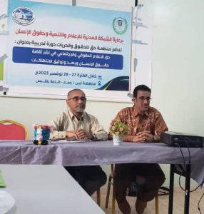 برعاية الشبكة المدنية للإعلام والتنمية وحقوق الانسان نظمت منظمة حق للحقوق والحريات صباح اليوم، بقاعة بلقيس، دورة تدرييية بمدنية جعار دورة تدريبية بعنوان دور الاعلام الحقوقي والاجتماعي في نشر ثقافة حقوق الانسان ورصد وتوثيق الانتهاكات.