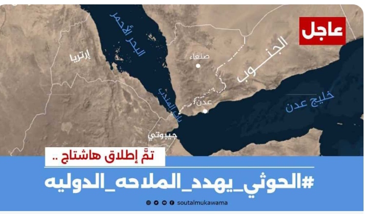 اطلق سياسيون جنوبيون هاشتاج #الحوثي_يهدد_الملاحه_الدوليه تزامنًا مع اعمال القرصنة الحوثية على المياه الدولية والإقليمية.