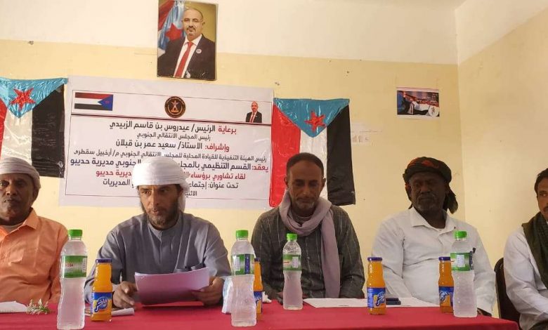 عقدت الهيئة التنفيذية للقيادة المحلية للمجلس الانتقالي الجنوبي في مديرية حديبو بمحافظة سقطرى، اليوم الاثنين، لقاء تشاوريا مع رؤساء اللجان المحلية في مراكز المديرية.