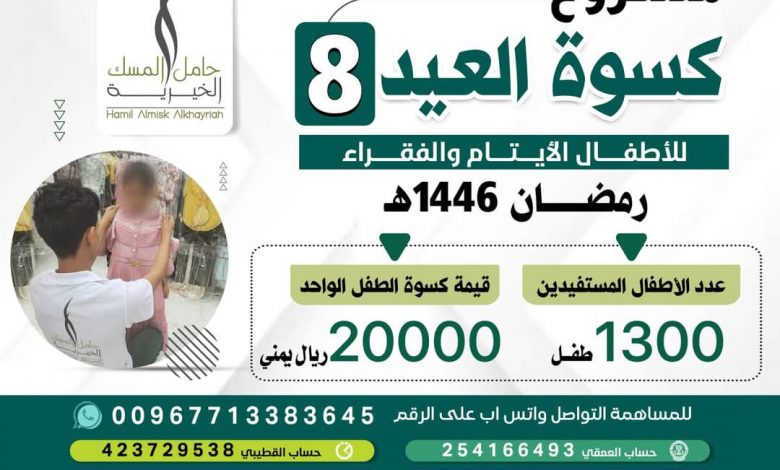 حامل المسك الخيرية تطلق مبادرة كسوة العيد للأطفال الفقراء والأيتام