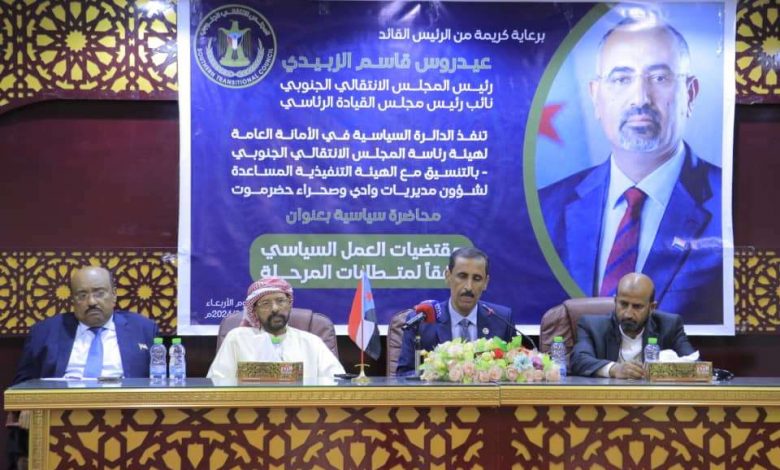 نظمت الدائرة السياسية بالأمانة العامة لهيئة رئاسة المجلس الانتقالي الجنوبي، بالتنسيق مع الهيئة التنفيذية المساعدة للمجلس الانتقالي الجنوبي لشؤون مديريات وادي وصحراء حضرموت، اليوم الأربعاء في مدينة سيئون، محاضرة بعنوان “مقتضيات العمل السياسي وفقاً لمتطلبات المرحلة”، برعاية الرئيس القائد عيدروس الزُبيدي.