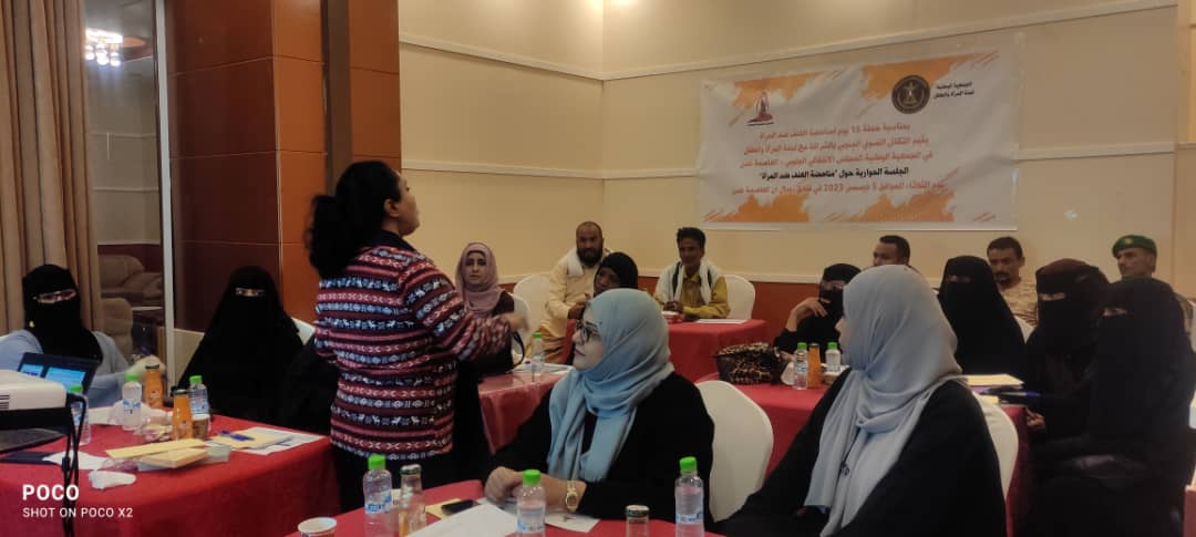 تأتي هذه الجلسة الحوارية بالشراكة مع لجنة المرأة والطفل بالجمعية الوطنية في المجلس الانتقالي الجنوبي، ضمن أنشطة وفعاليات الحملة العالمية السنوية( 16) يوم لمناهضة العنف ضد المرأة، شارك في الجلسة الحوارية (20) مشارك ومشاركة من مختلف اقسام الشرطة ، مكتب الشؤون الاجتماعية ، اللجان المجتمعية ، الجمعية الوطنية بالمجلس الانتقالي الجنوبي ، ومنظمات المجتمع المدني .