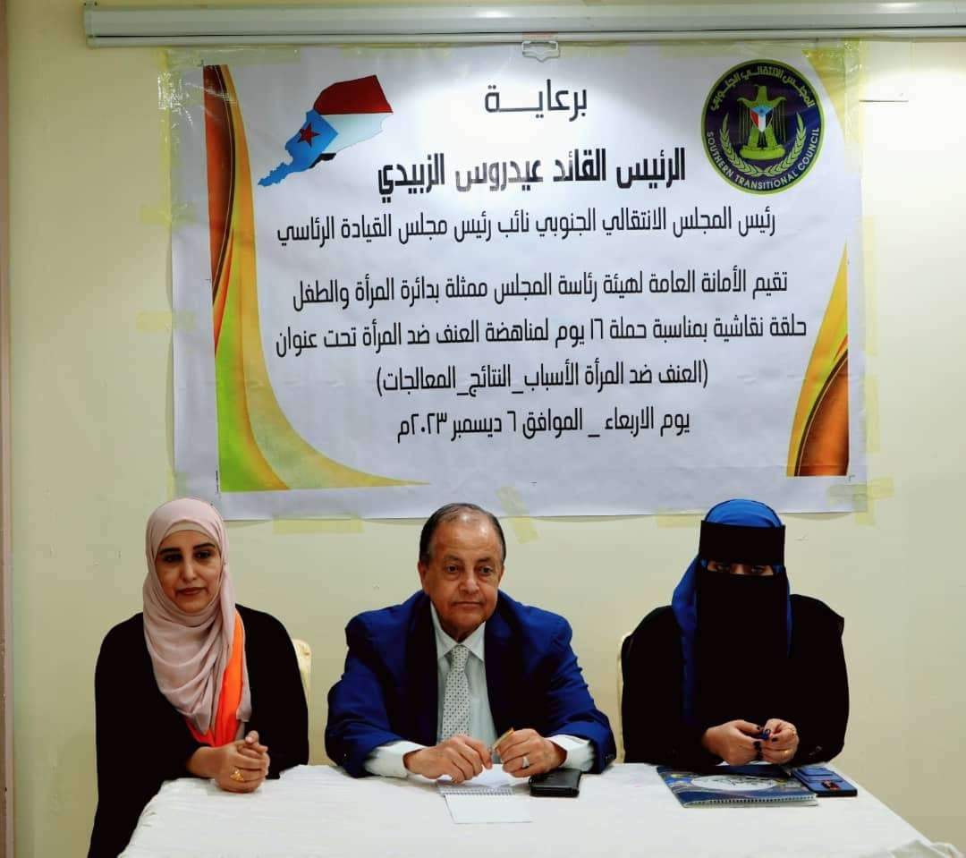 نظمت دائرة المرأة والطفل بالأمانة العامة لهيئة رئاسة المجلس الانتقالي الجنوبي، اليوم الأربعاء في العاصمة عدن، بمناسبة حملة الـ 16 يوما لمناهضة العنف ضد المرأة، حلقة نقاشية تحت عنوان ” العنف ضد المرأة، الأسباب، النتائج، المعالجات”.