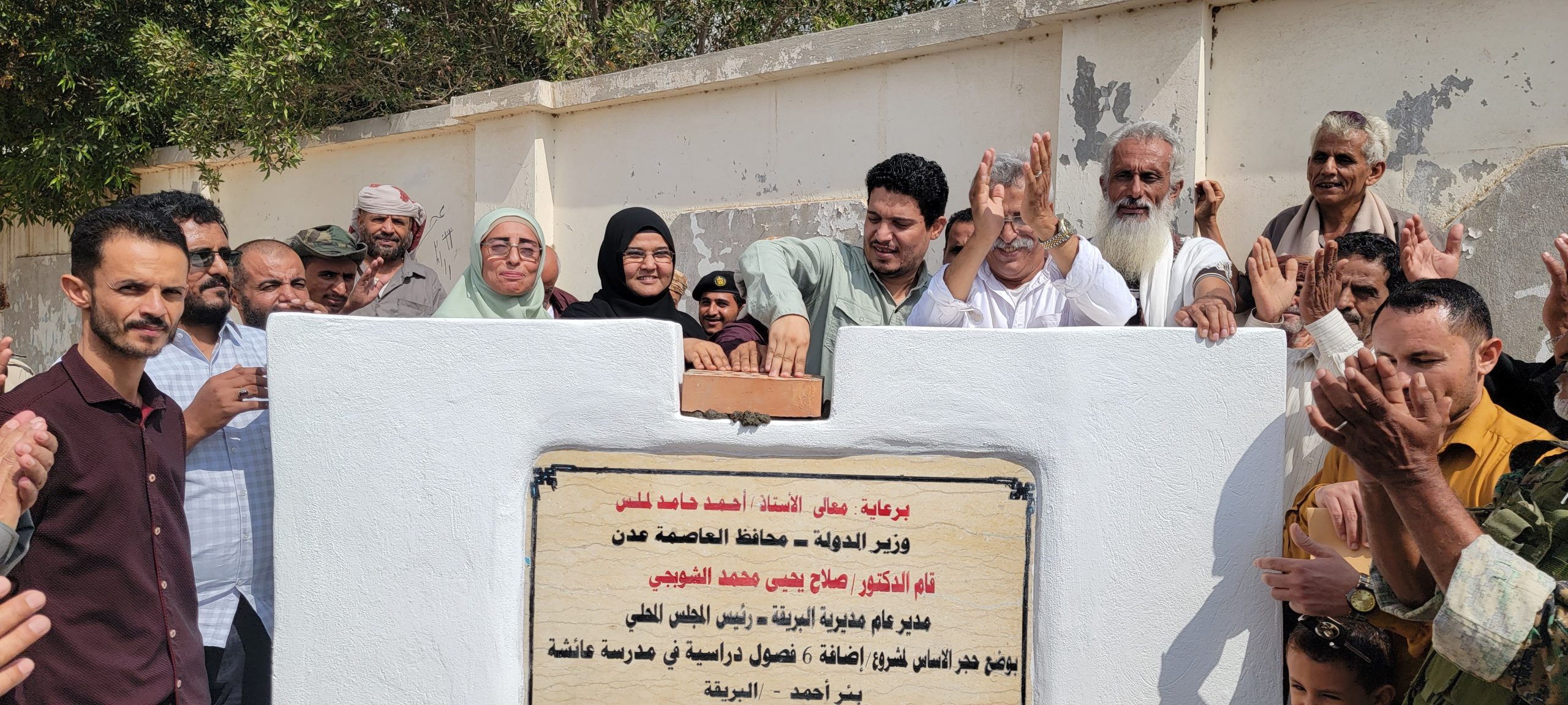 مدير عام البريقة يضع حجر الأساس لمشروع إضافة ( 6 ) فصول بمدرسة عائشة للبنات بمنطقة بئر أحمد