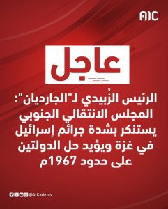 عاجل: الرئيس الزُبيدي لـ”الجارديان”: المجلس الانتقالي الجنوبي يستنكر بشدة جرائم إسرائيل في غزة ويؤيد حل الدولتين على حدود 1967م