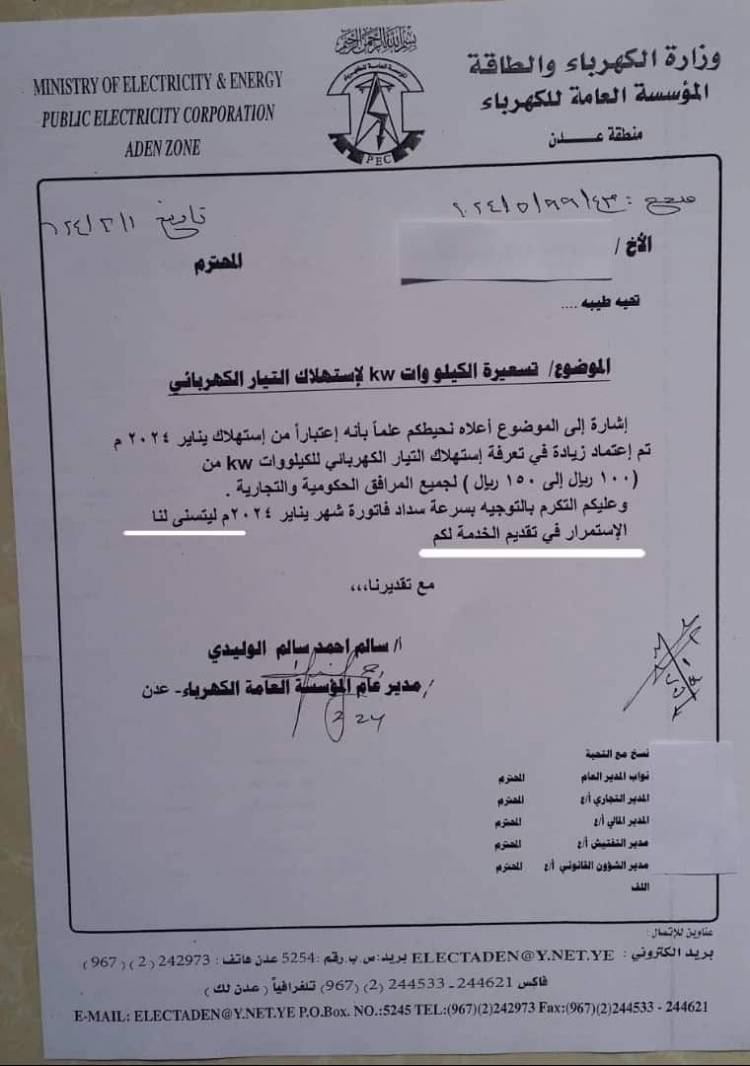 أعلنت مؤسسة كهرباء عدن، اليوم الخميس، عن زيادة تسعيرة الكيلو وات من 100 ريال إلى 150 ريال لجميع المرافق الحكومية والتجارية، بزيادة 50%.