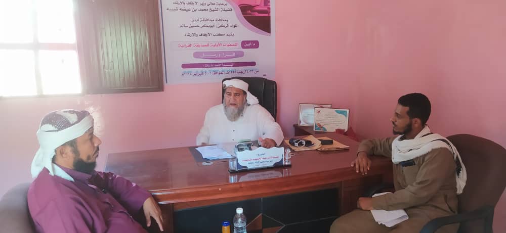 تتواصل لليوم الثاني على التوالي التصفيات الأولية للمسابقة القرآنية “اقرأ ورتل” التي يقيمها مكتب الأوقاف والإرشاد بمحافظة أبين والتي يرعاها معالي وزير الأوقاف والإرشاد الشيخ محمد بن عيضه شبيبه ومحافظ محافظة أبين اللواء الركن أبوبكر حسين سالم وتستمر من 3 وحتى 5 فبراير 2024م ويشارك فيها عدداً من القرأ وحافظين ومؤذنين للتأهل لتكوين منتخب يشارك في المسابقة التي تقيمها وزارة الأوقاف والإرشاد قطاع التحفيظ الإدارة العامة لمدارس تحفيظ القرآن الكريم للتنافس على لقب الوزارة المتميز في المراكز الثلاث الأولى.