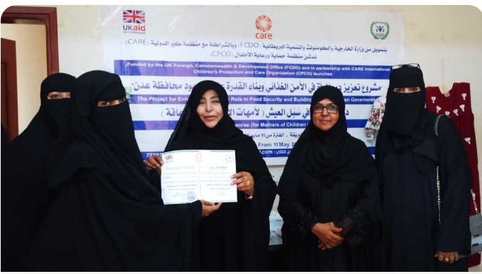 اختتام الدورة التدريبية في سبل العيش حول الخياطة بالعاصمة عدن لعدد ( 15 ) امرأة من أمهات الأطفال ذوي الإعاقة يوم الاثنين الموافق 2/6/2025م وتم يوم امس 3/6/2025 توزيع منح صغيرة للنساء المتدربات لادارة و تنفيذ مشاريعهن الصغيرة لدمجهن في سوق العمل وذلك ضمن مشروع تعزيز دور المرأة في الأمن الغذائي وبناء القدرة على الصمود ، والمنح هي عبارة عن(مكائن واقمشة ومستلزمات الخياطة المختلفة )التي نظمتها منظمة حماية ورعاية الأطفال(CPCO ) ضمن المشروع بتمويل من وزارة الخارجية والكومنولث والتنمية البريطانية (FCDO) بالشراكة مع منظمة كير الدولي (CARE).