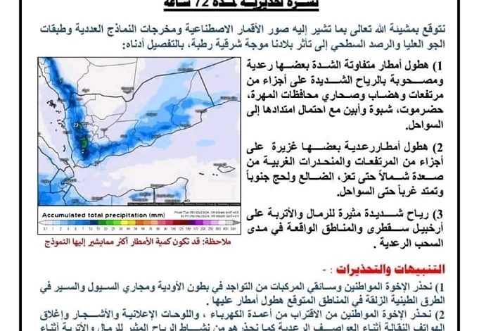 متابعة للحالة الجوية أصدر مركز التنبؤات الجوية والإنذار المبكر الهيئة العامة للطيران المدني والأرصاد قطاع الأرصاد الجوية- عدن نشرة تحذيرية لمدة 72 ساعة تضمنت التالي: