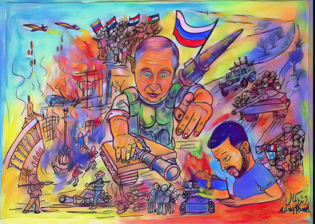 عبر الفنان اشرف كمال المخرج بالمركز القومي للسينما المصرية من خلال لوحته التى تعبر عن قوة الجيش الروسي فى الدفاع عن أرضه من خلال الكادر الواحد ويهديها هو والاعلامية سها البغدادي للرئيس بوتين فى ذكري 23 فبراير وهو يوم يتم الاحتفال به سنويا في روسيا واللوحة من أفكار الصحفية سها البغدادي التى تدعم الموقف الروسي فى الحرب ضد أوكرانيا وقد صورت اللوحة أحداث الحرب الروسية الأوكرانية ووصفت تقدم الجيش الروسي بقيادة الجنرال بوتين وتظهر فى خلفية اللوحة الشعوب العربية التى تدعم الرئيس بوتين مستدلة بأعلام دولهم كما أوضحت اللوحة ضعف الجانب الأوكرانيا وخضوعه أمام العملاق الروسي .