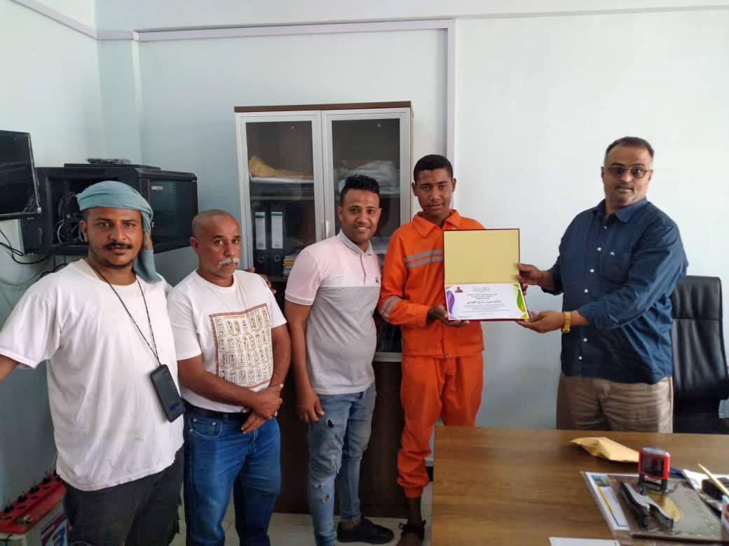 كرم مدير عام مديرية التواهي بالعاصمة عدن القاضي وجدي الشعبي، اليوم، عامل النظافة اسامة صبار صالح الجرمي، بشهادة تقديرية ومكافأة مالية، لإخلاصه وتفانيه في أداء عمله .