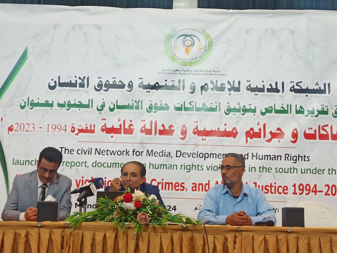 نظمت الشبكة المدنية للإعلام والتنمية وحقوق الإنسان، صباح اليوم في العاصمة عدن، مؤتمر صحفي اطلقت خلاله تقريرها الحقوقي الخاص بتوثيق انتهاكات حقوق الإنسان وجرائم التنظيمات الارهابية في الجنوب خلال الفترة 1994م وحتى ديسمبر 2023م، بعنوان: “انتهاكات وجرائم منسية وعدالة غائبة”.