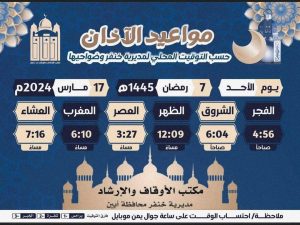 في بادرة طيبة ومتميزة يقوم مكتب الأوقاف والإرشاد مديرية خنفر محافظة أبين بنشر يومي لتوقيت الامساكية والافطار وأوقات الصلاة في مديرية خنفر، وذلك لتوحيد مواقيت الأذان لجميع مساجد المديرية.