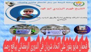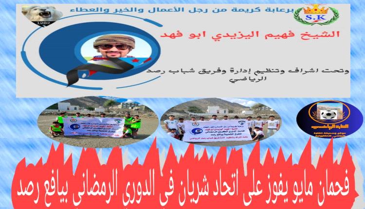 اقيمت عصر هذا اليوم الاثنين الموافق 18 مارس 2024م المباراة الرابعة بالدوري الكروي الرمضاني للفرق الشعبية بمديرية يافع رصد محافظة أبين جمعت بين فريق فحمان (مايو) واتحاد (شريان)، برعاية كريمة من رجل الأعمال والخير والعطاء الشيخ فهيم اليزيدي ابو فهد وتنظيم إدارة وفريق شباب رصد الرياضي وعلى ملعب ساجور الترابي بالعاصمة رصد، بقيادة طاقم تحكيمي مكون من حكم الساحة الكابتن محمد سالم فليس وحكام الراية حسين عبدالله محسن وصالح امين الجلادي وحكم رابع محمود سالم لحوري.