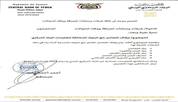 أصدر البنك المركزي اليمني اليوم، تعميم موجه الى كافة البنوك وشركات ومنشآت الصرافة ووكلاء الحوالات، ينص على إيقاف التعامل الكامل مع البنوك المخالفة لتعليمات البنك المركزي بما في ذلك الشبكات التابعة لها، والبنوك هي: