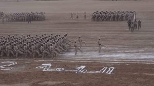 وفي حفل التخرج، قدّم المتخرجون عرضًا عسكريًّا مهيبًا، استعرضوا فيه أهم المهارات التي اكتسبوها في دورة التأهيل العسكري، وأظهروا في العرض انتظامًا مميزًا في خطواتهم وجاهزيتهم، ومعنويات عالية يتمتعون بها.
