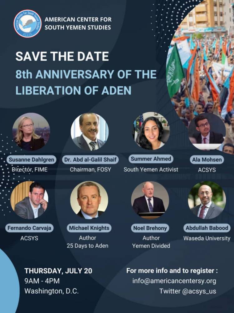 اعلن المركز الامريكي لدراسات جنوب اليمن ACSYS عن إقامة مؤتمر هام بمناسبة الذكرى الثامنة لتحرير العاصمة عدن من المليشيات الحوثية .
