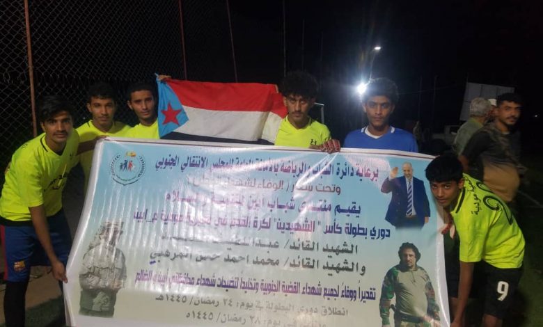 برعاية دائرة الشباب والرياضة بالأمانة العامة للمجلس الانتقالي الجنوبي وتحت شعار “الوفاء لشهداء الوطن” نظم منتدى شباب ابين للتنمية والسلام دوري بطولة كأس “الشهيدين الشهيد القائد_عبداللطيف السيد والشهيد القائد_ محمد احمد حسن المرهبي ، لكرة القدم في مديرية مودية بمحافظة ابين وذلك تقديرا” ووفاء” لكافة شهداء القضية الجنوبية وتخليدا” لتضيحات شهداء الوطن