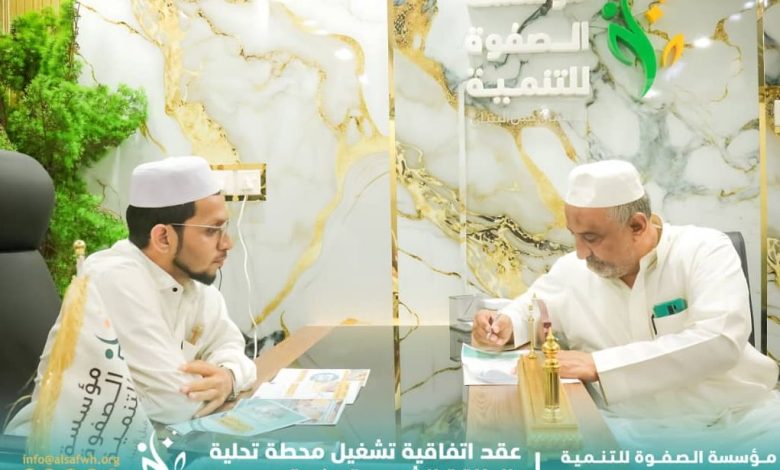 في إطار مشاريعها الخيرية المستدامة، وضمن مشروع سقيا الماء، وقّعت مؤسسة الصفوة للتنمية اتفاقية تشغيل محطة تحلية مياه الشرب، إضافة إلى بئر ارتوازية تعمل بالطاقة الشمسية في مديرية كريتر بالعاصمة عدن، وذلك امتدادًا للمحطات التي سبق للمؤسسة تمويل تركيبها خلال الفترة الماضية.