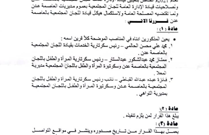 وفي المادة الثانية بتبليغ القرار لمن يلزم تنفيذه وفي مادته الثالثة العمل بهذا القرار من تاريخ صدوره وينشر في مواقع التواصل الاجتماعي للجان المجتمعية بالعاصمة عدن وإلغاء أي تكليف سابق أو قرار.