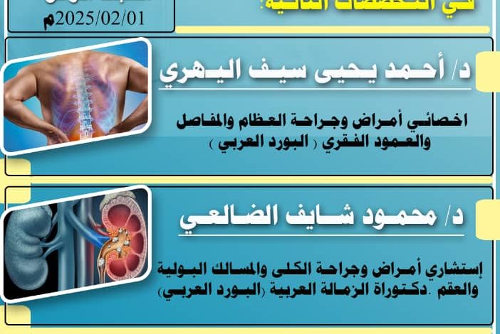 يعلن مستشفى الشهيد عبدربه جبران الرشيدي (مستشفى رصد العام) عن استضافة نخبة من الأطباء الاستشاريين من حملة البورد العربي، وذلك يوم غدٍ السبت الموافق 1 فبراير 2025، برعاية كريمة من مستوصف دار الحكمة الطبي يافع – لبعوس.