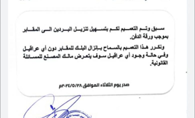 وأكد ” أنه سبق وتم التعميم بذلك سابقا ويتم تجديد ذلك التعميم ، محذرا المصدر مالكي المصانع في حال عدم التعاون مع ذوي الميت وبيع البردين لهم بحسب ورقة الدفن، فإن وحدة حماية الأراضي ستتخذ الإجراءات القانونية ضدهم .