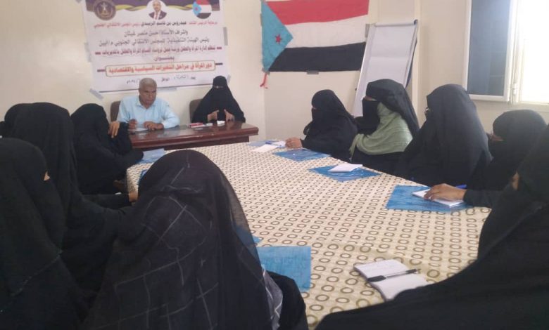 نظمت إدارة المرأة والطفل بالهيئة التنفيذية للقيادة المحلية للمجلس الانتقالي الجنوبي في محافظة أبين، اليوم الثلاثاء، ورشة عمل بعنوان “دور المرأة في مراحل التغيرات السياسية والاقتصادية”.