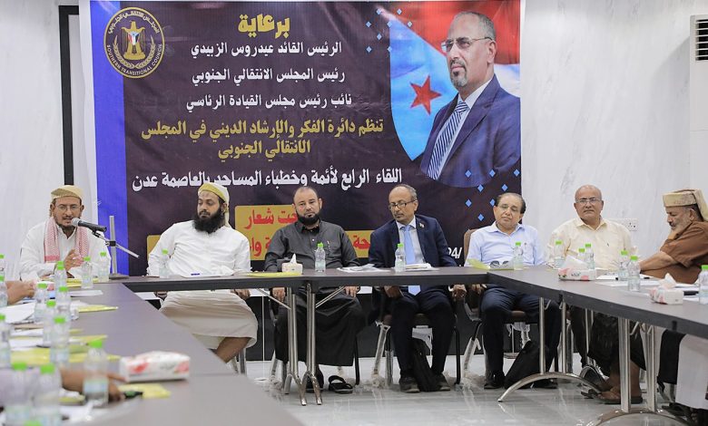 عقدت دائرة الفكر والإرشاد في الأمانة العامة لهيئة رئاسة المجلس الانتقالي الجنوبي، اليوم الخميس، اللقاء التشاوري الرابع مع ائمة وخطباء مساجد العاصمة عدن، برعاية الرئيس القائد عيدروس الزبيدي رئيس المجلس الانتقالي الجنوبي نائب رئيس مجلس القيادة الرئاسي.