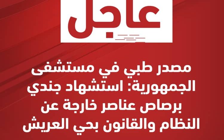 مصدر طبي في مستشفى الجمهورية: استشهاد جندي برصاص عناصر خارجة عن النظام والقانون بحي العريش