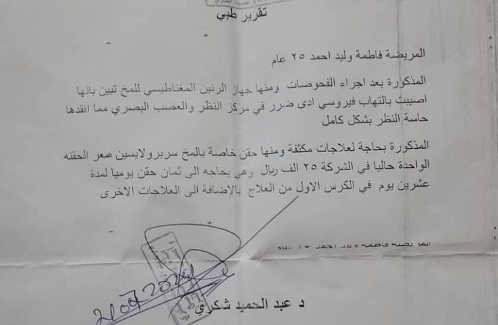 تعرضت الفتاة فاطمة وليد أحمد البالغة من العمر 25 عام حسب تقرير الدكتور عبدالحميد شكري أستشاري جراحة المخ والأعصاب والعمود الفقري إلى التهاب فيروسي أدى إلى ضرر في مركز البصر والعصب البصري مما افقدها حاسة النظر بشكل كامل والمريضة بحاجة لعلاجات مكثفة ومنها حُقن خاصة بالمخ سربرولايسين سعر الحقنة الواحدة في الشركة 25 ألف ريال وهي بحاجة إلى ثمان حُقن يومياً لمدة عشرين يوم في الكرس الأول من العلاج بالإضافة إلى العلاجات الأخرى.