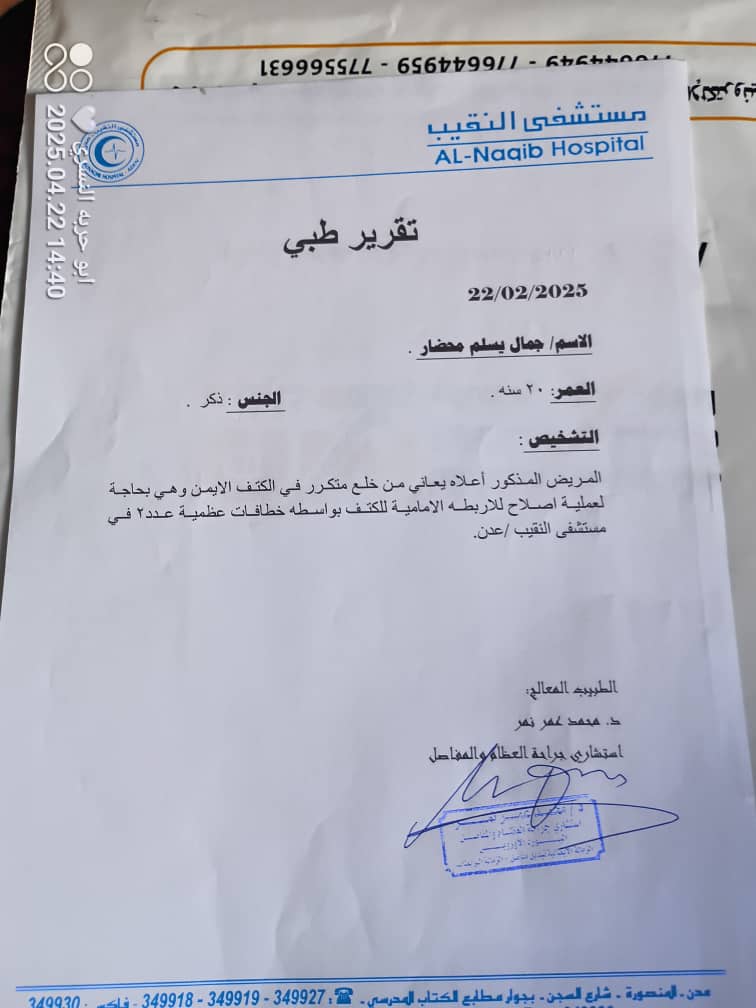 وقد تبين بعد اجراء الفحص والمعاينة على المريض جمال يسلم، أنه يعاني من خلع في كتفه الأيمن، وبحاجة إلى تدخل جراحي عاجل، (إصلاح للاربطة الأمامية للكتف) بواسطة خطافات عظمية عدد “2انكر”، وإعادة الكتف إلى موقعه الطبيعي، حسب مااوصى به تقرير الطبيب المعالج الدكتور محمد عمر نهر، استشاري جراحة العظام والمفاصل، في مستشفى النقيب بعدن.