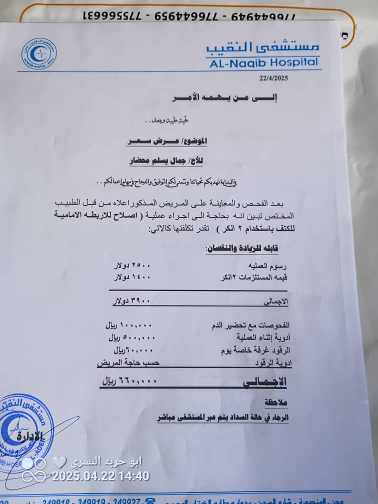 ويشمل العلاج الطبي، مع الفحوصات والأدوية، اليومية حسب حالة المريض، ورسوم العملية، حوالي 4000 دولار، ونتيجة لضيق ذات اليد، يناشد المريض جمال يسلم محضار أهل الخير وأصحاب الايادي البيضاء مساعدته، حتى يتمكن من إجراء العملية، وتغطية تكاليف العلاج، خصوصا وأن التأخير في إجراء العملية قد يؤدي إلى فقدان جزئي أو كلي للوظيفة في الكتف أو الذراع، حسب كلام الطبيب المختص، ونحن بدورنا نناشد فاعلي الخير والباحثين عن الاجر والثواب الوقوف إلى جانب المريض جمال، الذي يعاني الآلام والاوجاع، حتى يعود إلى وضعه الطبيعي، بعد أن أصبحت أسرته غير قادرة على توفير المبلغ المطلوب، لإجراء العملية لابنها، جمال يسلم”يتيم الأب” والله لايضيع اجر من احسن عملا .