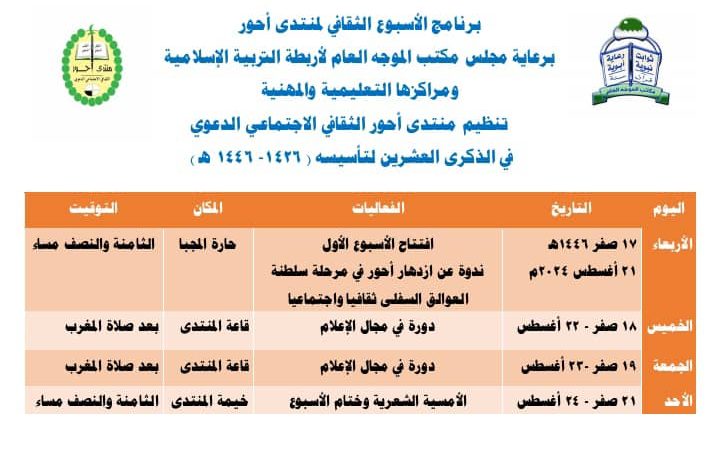منتدى أحور الثقافي الاجتماعي الدعوي يعلن عن برنامج فعاليات الأسبوع الثقافي بالمديرية