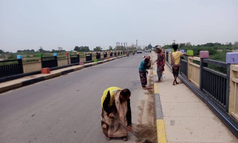 عمال صندوق النظافة بزنجبار يواصلون جهودهم للحفاظ على جمالية جسر الصين مدخل محافظة أبين