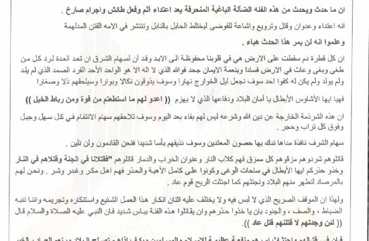 ووصف البيان إن العملية الإرهابية التي تعرض لها الجنود هو اعتداء أثم وفعل طائش وإجرام صارخ وأنه قتل وترويع واشاعة للفوضى ليختلط الحابل بالنابل وتنتشر في الامه الفتن.