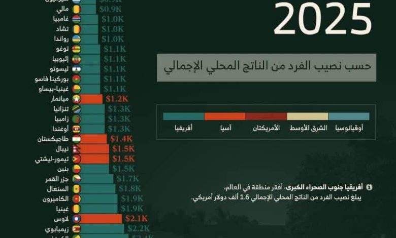 أظهر تقرير اقتصادي دولي حديث حصول اليمن على مرتبة متقدمة ضمن قائمة أفقر دول العالم لعام 2025 وفقًا لتقييم Visual Capitalist الذي صنّف الدول بحسب نصيب الفرد من الناتج المحلي الإجمالي.