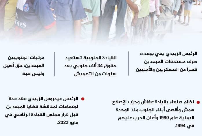 وذكروا بالعهد الذي قطعه الرئيس القائد عيدروس بن قاسم الزُبيدي، قبل سنوات، تجاه أبناء الجنوب في السلك العسكري والأمني المُبعدين قسرًا، والمُتمثل بوعدهم باستعادة حقوقهم كاملةً دون نقصان، وهو ما تحقق ببدء تدشين صرف مستحقات قرابة (34) ألف من العسكريين والأمنيين والموظفين الجنوبيين المُبعدين قسرًا.