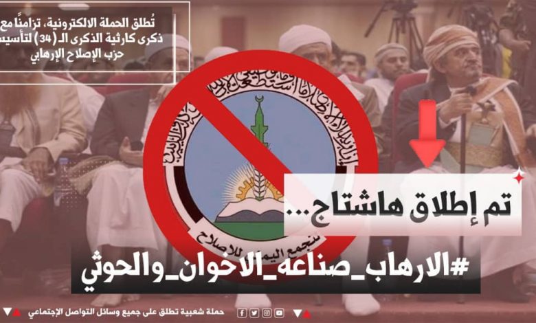 وجاء الهاشتاج تزامنًا مع ذكرى كارثية، الذكرى الـ (34) لتأسيس حزب الإصلاح الإرهابي، والتي تُصادف يوم الجمعة 13 سبتمبر 2024م، والذي تأسس في 13 سبتمبر من عام 1990م، كاشفين جرائم هذا الحزب التكفيري الإرهابي.