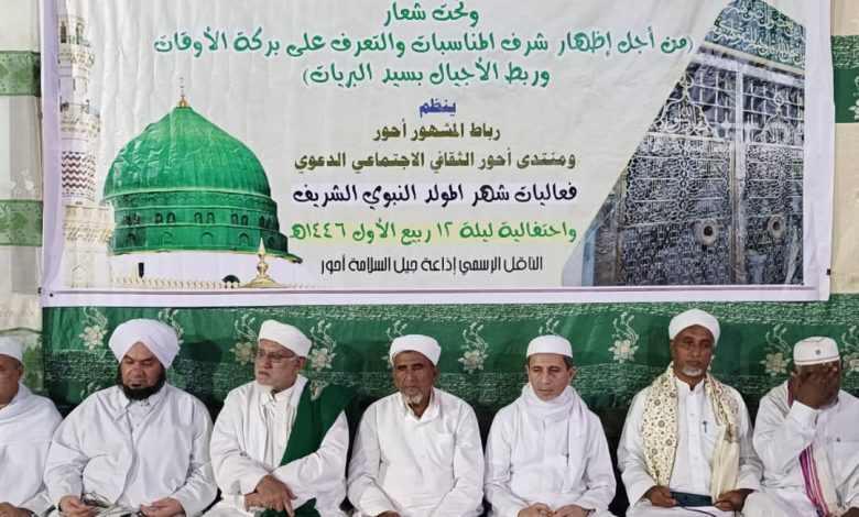 في أجواء روحانية غمرتها نفحات إيمانية ملئها الأمن والطمانية والسلام والمحبة أحتفل أهالي مدينة أحور وأريافها مساء يوم أمس السبت الثاني عشر من ربيع الأول بذكرى المولد النبوي الشريف بحفل بهيج في ساحة رباط المشهور برعاية مكتب مجلس الموجه العام لأربطة التربية الإسلامية ومراكزها التعليمية والمهنية وبتنظيم رباط المشهور ومنتدى أحور الثقافي الاجتماعي الدعوي بالشراكة مع إذاعة جيل السلامة بأحور الناقل الرسمي لفعاليات شهر ربيع.