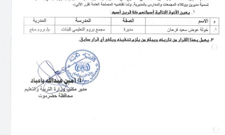 أصدر صباح يوم الأثنين مكتب التربية بساحل حضرموت ممثلا في المدير العام الأستاذ أمين عبدالله باعباد قرارا إداريا بتعين الأستاذة خولة عوض فرحان مديرا لمجمع بروم التعليمي للبنات .