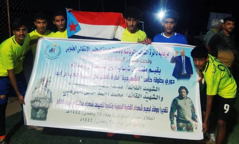 بحضور رئيس الهيئة التنفيذية للقيادة المحلية بالمجلس الانتقالي بمديرية مودية بمحافظة أبين الاستاذ حسين عبدربه دحة انطلقت مساء الأربعاء منافسات بطولة كأس الشهيدين عبداللطيف السيد والشهيد محمد احمد حسن المرهبي التي ينظمها منتدى شباب أبين للتنمية والسلام برعاية دائرة الشباب والرياضة بالأمانة العامة لهيئة رئاسة المجلس الانتقالي الجنوبي